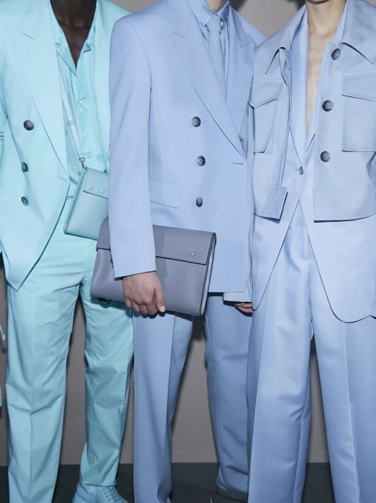 Izlazeći na pistu, muške kožne sandale sa kaiševima i patike nalaze se tik uz ženke papuče od čvrste i pletene kože. Aksesoari imaju oblik kompaktnih torbi blok boja, a muške kožne torbice i rančevi su obeleženi inicijalima pojedinačnih korisnika.