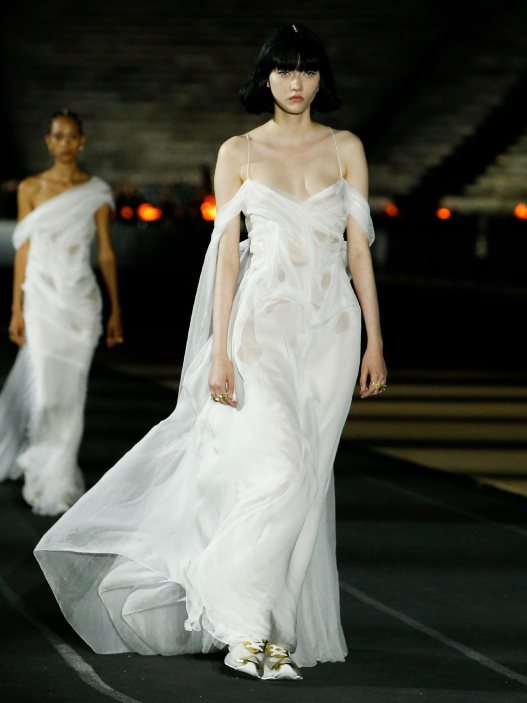 Haljine nalik onima koje su nosile grčke boginje promicale su pored belih pantalona oštrih krojeva, dozivajući ikone poput Marlene Dietrich. Karirani dezeni i nabori susreću se s izgledom koji se odlučno naslanja na street style odeću.
