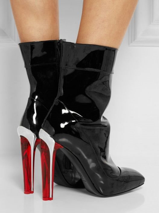Mi smo se na prvi pogled zaljubili u poluduboke čizmice lakovane crne kože, ručno napravljene u Italiji koje krasi crvena četvrtasta peta od perspeksa. Detalji poput štepa i srebrne igle kojom je akrilno staklo optočeno dodatno su ovaj model učinili zavodljivim i poželjnim.