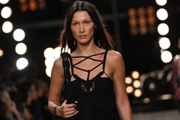 Manekenka Bella Hadid odlučila se za total kožni outfit. Nosila je kožne pantalone sa vidljivim štepom, retro jaknu i seksi bordo korset, uz aksesoare u vidu leopard torbice i crnog rajfa.