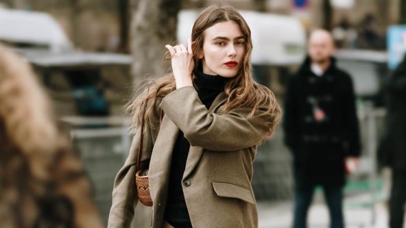 Tanje pletivo poput kašmirske rolke omogućava nam da slažemo slojeve bez narušavanja siluete, što je Lena Farl upravo učinila. Dodavanjem drugog džempera obmotanog oko ramena i pletene kapuljače u kontrastnoj neutralnoj nijansi, kreirala je bogatu teksturu i dimenziju. Balansirajte outfit širokim nogavicama, kako gornji deo ne bi delovao previše masivno.