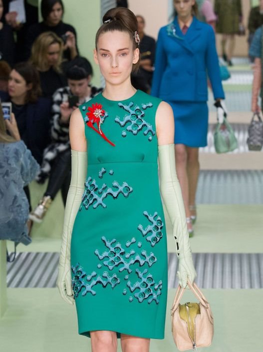 Muške, stroge krojeve koji su obeležili prethodne Miuccine kolekcije, zamenile su suptilne 60-te, pastelna paleta i neopren. Manekenke su izgledale nekako surealno bez šminke ( s tek naglašenim obrvama i licem koje se sjajilo od kreme) sa cvetnim broševima ( zoom na njih nam je pružio mogućnost da vidimo kako se sastoje od plastičnog većeg motiva i manjeg, skupocenijeg od dijamanata) koji su iz daljine izgledali kao iguana koja puže po odeći. Za futurističan, pop look se pobrinula i kosa: visoki rep, natapiran sa strane i ukrašen sa floroscentnim šnalama nalik brošu.