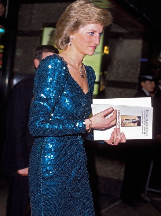 Plavozelena Catherine Walker haljina od perlica, namenski je dizajnirana za zvaničnu posetu austrijskom princu, 1986 godine. Nakon ovoga, princeza ju je nosila još nekoliko puta.