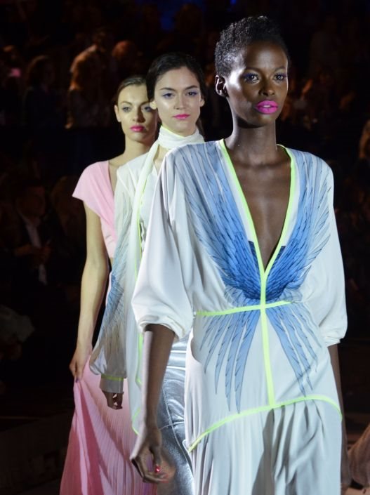 A modeli? Čista sofisticiranost odevena u najlepše nijanse neon zelene, puderasto ružičaste, fuksije, prugice i baby plave. Naš favorit? Prugaste kilote, srebrna jakna i ljubičasta maksi haljina.