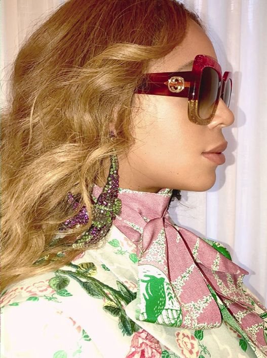 Ispred bele zavese, žena repera Jay Z -a, pozira u floralnom Gucci blejzeru, šarenoj bluzi, iscepanim farmerkama i Saint Laurent sandalama, četvrtastim šljokičastim oversize naočarama, žutom torbicom i višebojnim minđušama.
