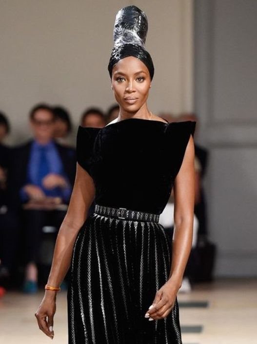 Naomi koja već odavno prihvata samo pozive dizajnera koji su joj lični prijatelji je otvorila je reviju odevena u kraću crno-belu bundicu da bi reviju zatvorila u svetlucavoj crnoj haljini.. Zahvaljujući kosi koja joj je bila stilizovala u crni, visoki turban Campbell je izgledala nalik egipatskoj kraljici Nefretiti dok je lebdela kroz publiku.