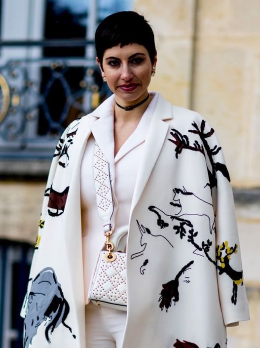 Mi smo je primetili u Parizu gde je ispratila drugi dan PFW karavana u belom kaputu uzanih, sofisticiranih revera koji krase efektne aplikacije apstraktnog životinjskog sveta. Ispod ovog krajnje statement kaputa, lepa Deena ponela je beličaste pantalone i blejzer od deblje vune. Finiš je bio otmen i vrlo classy: salonke u tamnoj nijansi bordo boje sa kristalno cvetnim ukrasom pri vrhu i belo-žuta torba sa otisnutim rupicama po teksturi.