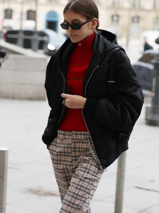 Poslednji street style izdanje, nove miljenice modeling scene potvrđuje njen status IT cure. Naime, Kaia se na ulicama Pariza posle završetka PFW-a pojavila u sivkastim baggy pantalonama na štrafte, belom Versace majicom sa natpisom logoa i oversize kožnoj jakni u stilu 80-ih.