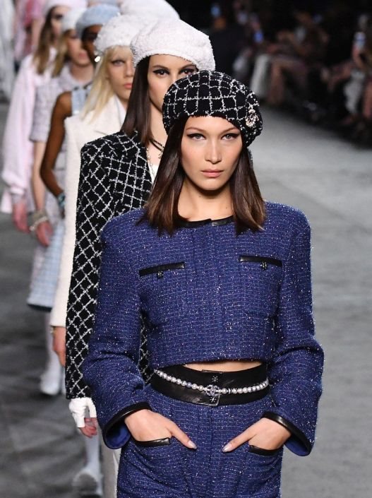 Plejada najpopularnijih manekenki današnjice Gigi i Bela Hadid, Stella Maxwell, Adut Akech i druge, samouvereno su nosile prugaste pantalone, bluze i blejzere ravnog kroja, "I" siluete haljina, kropovane majice, bele i ružičaste čarape, ravnu obuću kao i nezaobilazne beretke.
