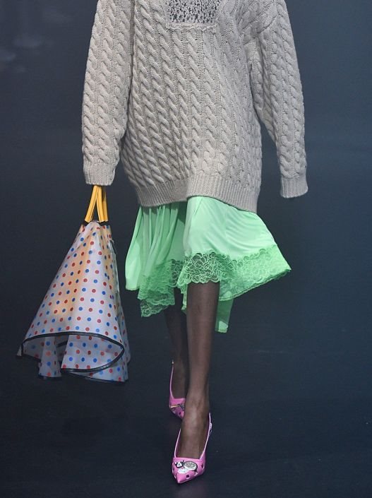 Jarka boja, ukrasi u vidu cveća, zastava, slova u kombinaciji sa visokom, tankom štiklom i špicem u totalu ostavljaju utisak da mogu da se kupe u prodavnici u Diznilendu, ali Demna ipak zna šta radi.