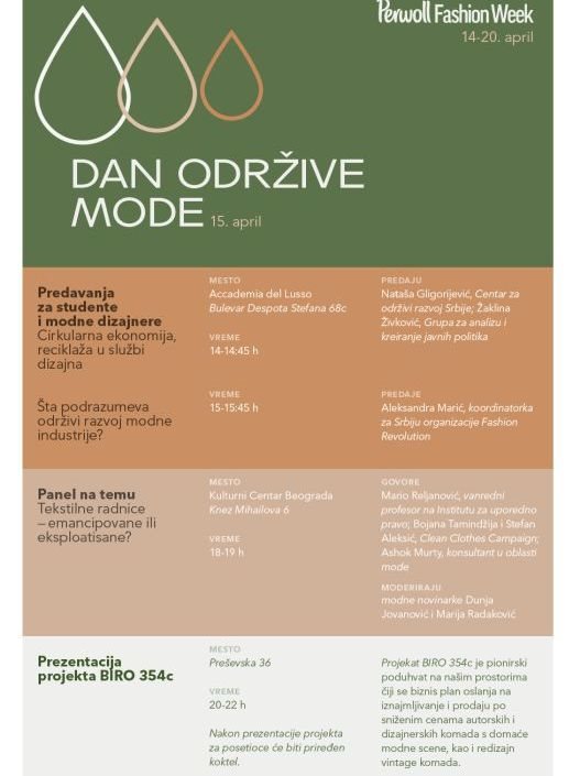 Podizanje svesti o ovim problemima jedan je od glavnih fokusa ne samo modne industrije, već i brojnih građanskih inicijativa i aktivista, a u tom cilju Perwoll Fashion Week 15. aprila priređuje prvi Dan održive mode u okviru kog će se mapirati brojne poteškoće domaćeg tržišta, ali i razmišljati o rešenjima i konkretnim predlozima za inovacije u modnom poslovanju.