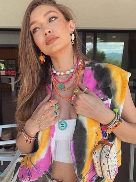 Za najpoznatiji festival u Americi, Gigi je nosila tie-dye prsluk Ganni, sa podrezanim belim topom ispod. Print inspirisan 60-im godinama, u narandžastoj, crnoj i ružičastoj boji, bio je prikladni grafički komad za događaj, gde se ide da bi bio viđen i ovekovečen na street style fotografijama.