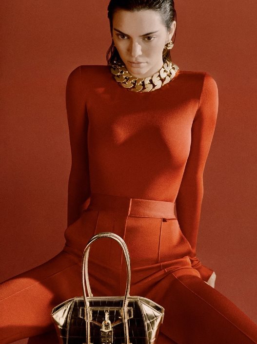 Jedan od najefektnijih stajlinga osmislila je Kendall Jenner u koralnocrvenoj monohromatskoj kombinaciji, sa pozadinom u istoj boji. Baš kao i u privatnom životu, Kendall je našminkana minimalno, negujući natural look. Između nogu je postavljena blistava Givenchy Antigona tašna iz nove kolekcije.