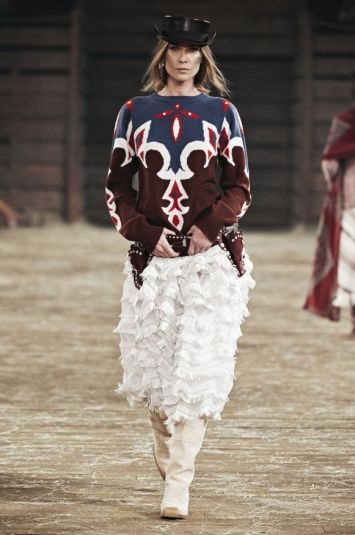Na reviji smo videli kolekciju koja je u potpunosti inspisana Teksasom, i u kojoj su dominirali prelepi, rustični detalji, džemperi s motivima astetske kulture, i ogrtači s resama, raskošnim perjem.