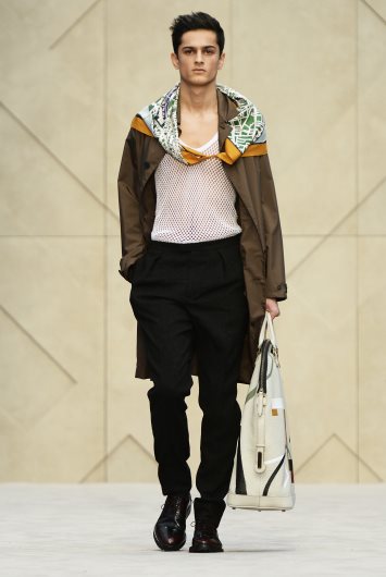 Uz akustičnu pratnju muzičara Sive i još nekoliko umetnika, i pred brojem eminetnih zvanica prodefilovao je Burberry muškarac koji je odlučio da se stilizuje u crne, široke pantalone, klasičan trenč uparen s maramama efektnog printa. Na reviji koju je bilo moguće pratititi i uživo na zvaničnom sajtu brenda, videli smo i mrežaste majice, zatim košulje u cvetnom printu, kao i majice izrazito dubokog V izraza koje su imaju motiv crkve.