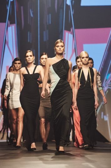Upečatljiv momenat su bile naglašene “boldovane” linije koje su svoju suprotnost imale u neon hipi resama, prisutnim na haljinama, suknjama, ogrtačima, kao i printu koji je inspirisan grafičkim dizajnom provučenim kroz arhitektonske elemente.
