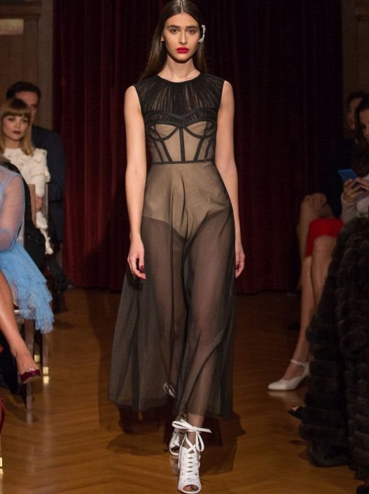 Zanimljivost je i da su dizajnerkine omiljene pastelne nijanse odmenile neke nove boje, poput narandžaste, metalik zelene, srebrne, smeđe, pa čak i crne, a ljubiteljke nežnih tonova, sigurno će se zaljubiti u svetlo plavu mini haljinu od neobrađene svile u bogatim slojevima volana apliciranih na providnu tkaninu.