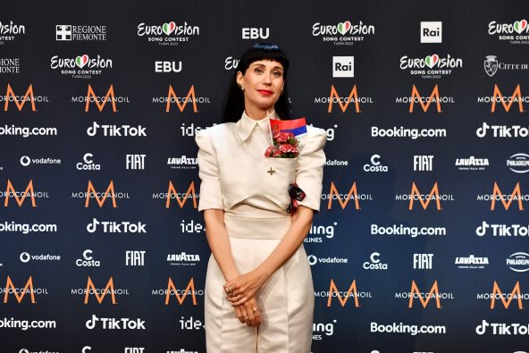 Još jedna kreacija Aleksandre Lalić koju je Konstrakta nosila više puta, a posebno je primećena na otvaranju finala Evrovizije kada je umetnica izašla sa srpskom zastavom. Bela boja simbolično prati Konstraktu u većini zvaničnih pojavljivanja, a Lalica je našla način da je učini drugačijom i originalnom.