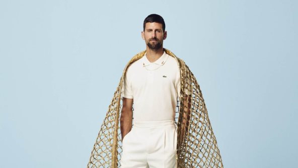 Obučen u klasični Lacoste polo u nijansi prljavo bele, Novak Đoković je ogrnut zlatnom teniskom mrežom pretvorenom u kraljevski plašt. Ova slika odaje počast i čoveku i odeći, slaveći Đokovićev neosporan status GOAT-a, ali i potvrđujući mesto Lacoste poloa među ikonama mode i sporta.