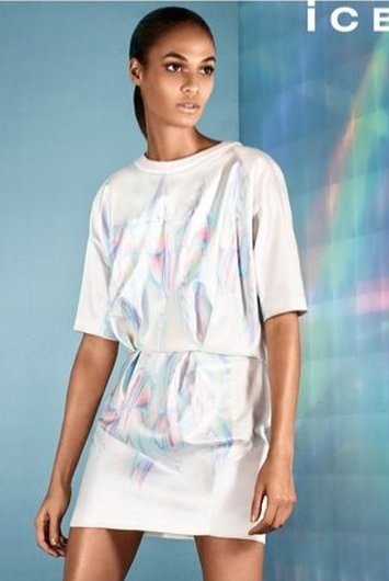 Joan pozira u modelim all in white, minimalističnog dizajna koje, i to tek po neka, imaju floroscentne art detalje koje je na fotografiji ispratio sličan lajtmotiv u pozadini koji je uradio umetnik Dan Flavin koji je umetnik za rasvetu.