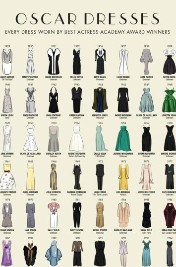 Zanimljiva ilustracija prikazuje modele haljina od samog početka dodele Oskara, 1929. godine kada je Oskara za Najbolju žensku dobila glumica Janet Gaynor koja se pojavila u haljini ¾ s dugim svilenim rukavima i V izrazom. Tu je i Givenchy haljina koju je Audrey Hepburn nosila 1954.godine, kao i Gwyneth Paltrow u Ralphu Laurenu, Jennifer Lawrence u Dioru....