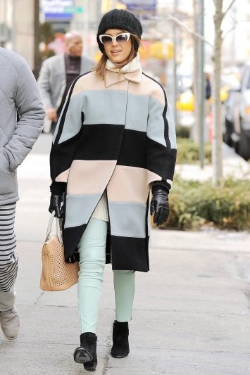 Alba koja van crvenog tepiha preferira casual, urbani stil sa vrlo malo šminke i detalja, uočena je u krajnje stajliš kombinaciji: oversize kaput oblih ramena u horizontalnoj crno-plavo-pink kombinaciji, mekan džemper s rolkom nalik tunici, slim pamučne pantalone u nežnoj, tirkiznoj boji i ravne poluduboke čizmice od prevrnute kože.