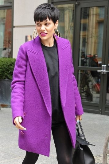 Naravno, kompletan autfit nije mogao da prođe bez funky detalja koje Jessie obožava da nosi. Ovoga puta, pevačica je izabrala da i u toj sferi bude svedena: zlatne alke, poluduboke crne čizmice na platformu, kompaktna crna torba i plavi manikir. Kao poseban detalj poslužio je ruž u identičnoj boji kaputa. Purple chic!