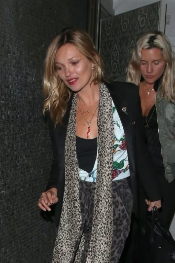 Kate je uspela „nekako“ da upari baggy, sive pantalone u animal printu sa crnim topom, havajskom košuljom i ešarpom u zagasitom, takođe animal printu, ali drugačijem od onog kojim dominira pantalonama. Preko topa, Mossova je obukla crni blejzer, dok je na nogama imala par poludobokih, otvorenih čizmica.