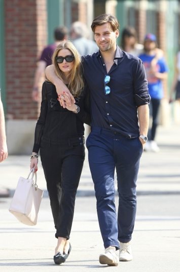 Dnevni look: Kraljica prefinjenog stila, Olivia Palermo je izabrala da za šetnju sa svojim hot verenikom Johannesom Hueblom obuče crnu prozirnu bluzu s dugim rukavima, tregere od tamnog denima i baletanke neobičnog dezena. Puštena kosa i naočare: savršen dnevni look.