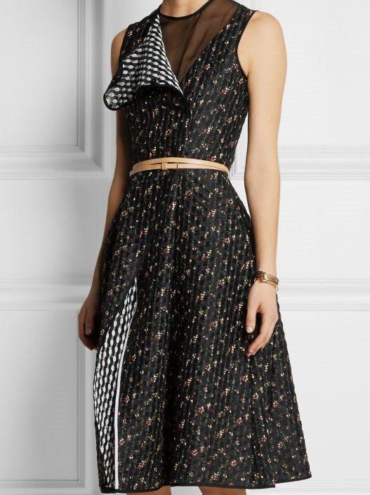 Naš poslednji VB crush je rezervisan za haljinu od organdin svile u mikro, cvetnom dezenu u žutoj, sivoj i crvenoj boji, sa asimetričnom kragnom u crno-belom karo dezenu.