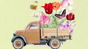 Ilustracija kamiona na kom je cveće.